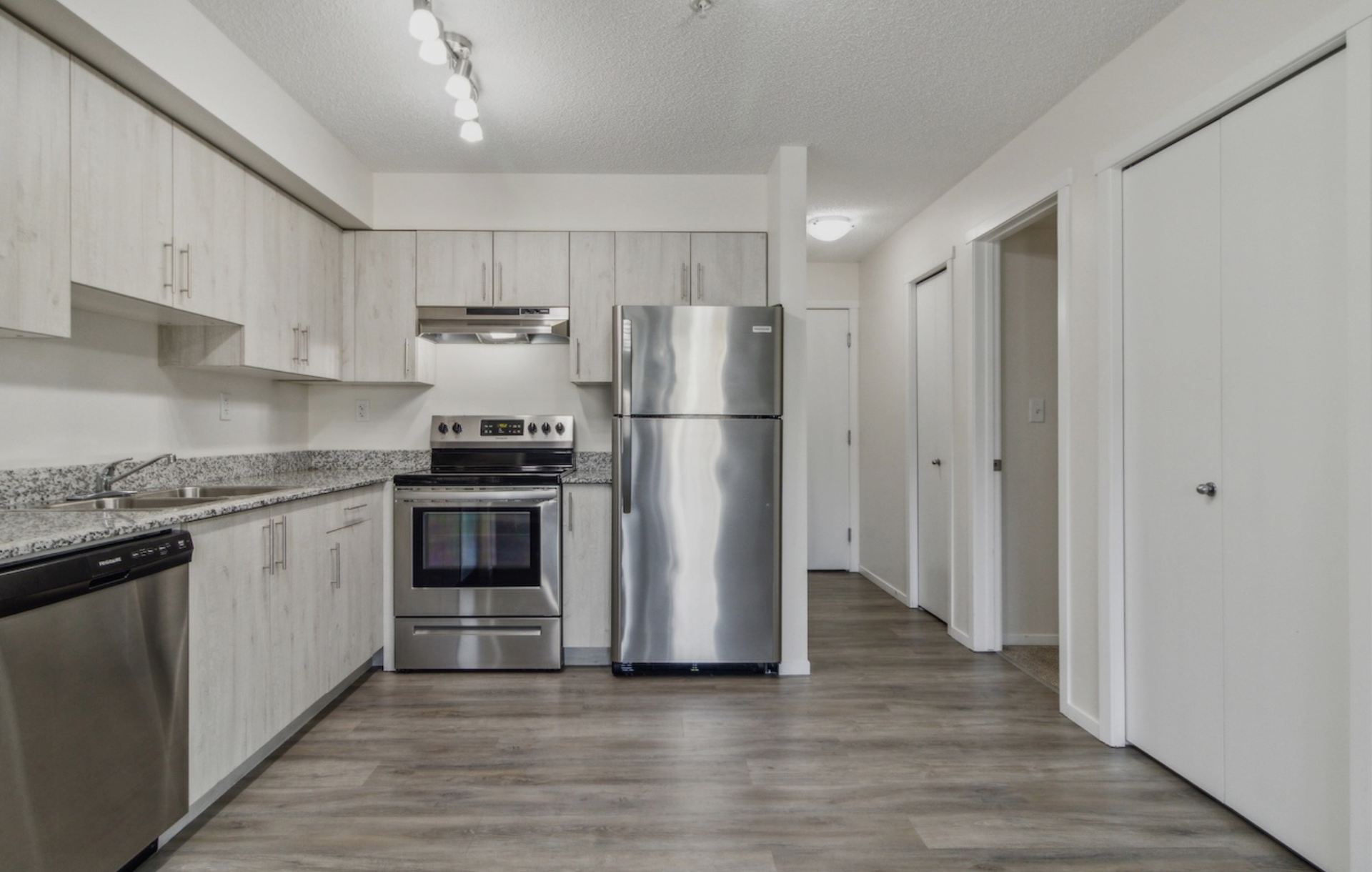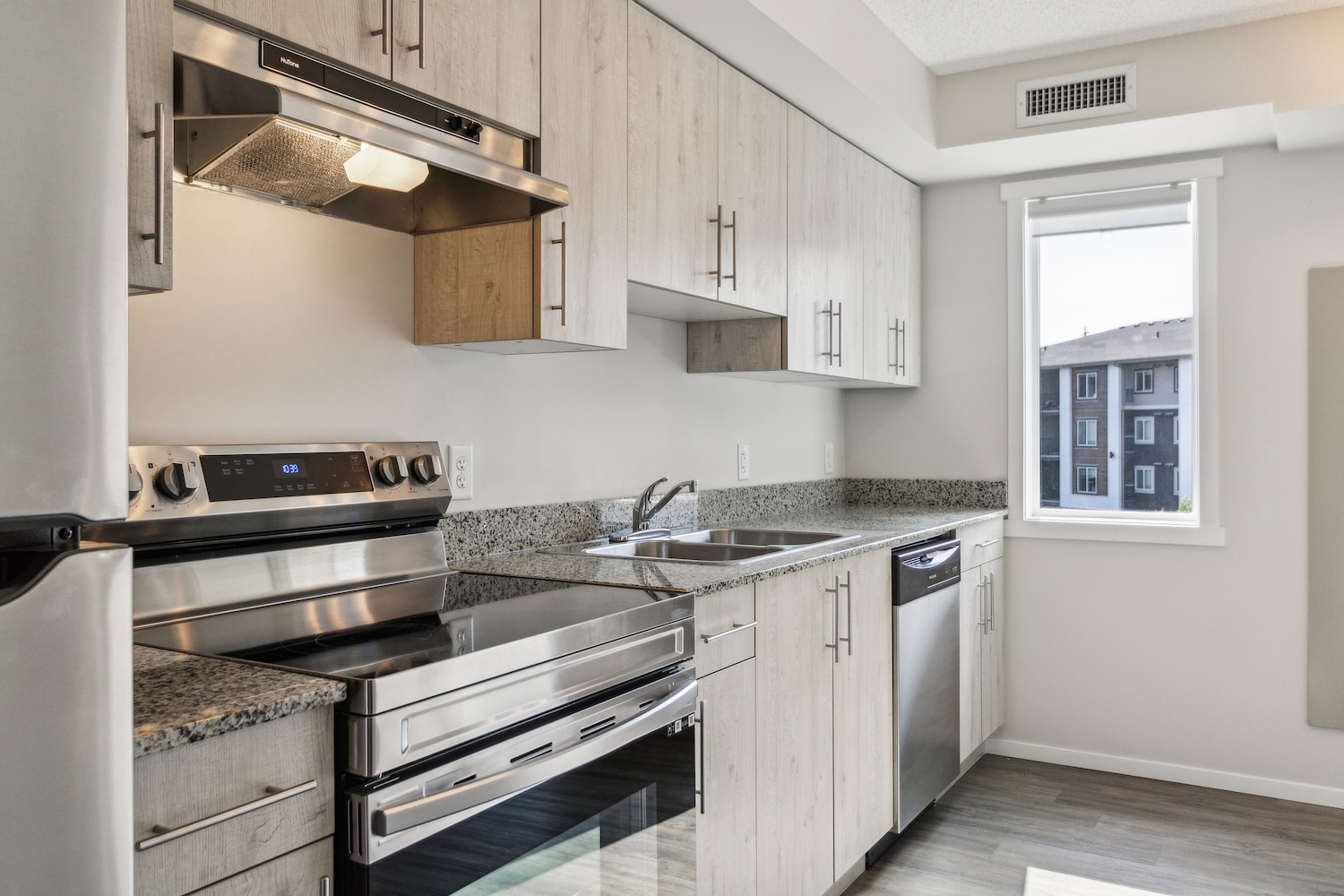 Beautifully designed kitchens complete with stainless steel appliances and granite counters.